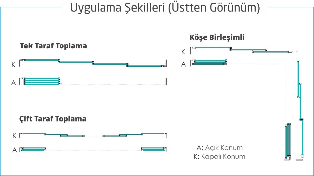 Sistemin en dıştaki rayına istenirse perde, istenirse sineklik, istenirse kepenk bağlanabilir. Bu sayede çok şık bir şekilde güneşi ve sinek geçişini kontrol edebilirsiniz.